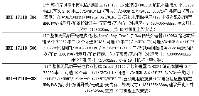 HMI-1711T-S是一款配置17” LCD 液晶屏的低功耗工業級平板電腦,采用Intel® Atom J1900/J4125 四核低功耗處理器,具有豐富的I/O 接口,可廣泛應用于如電氣測試校驗臺、煙草物流檢測設備、橡膠機械、測試設備等領域。